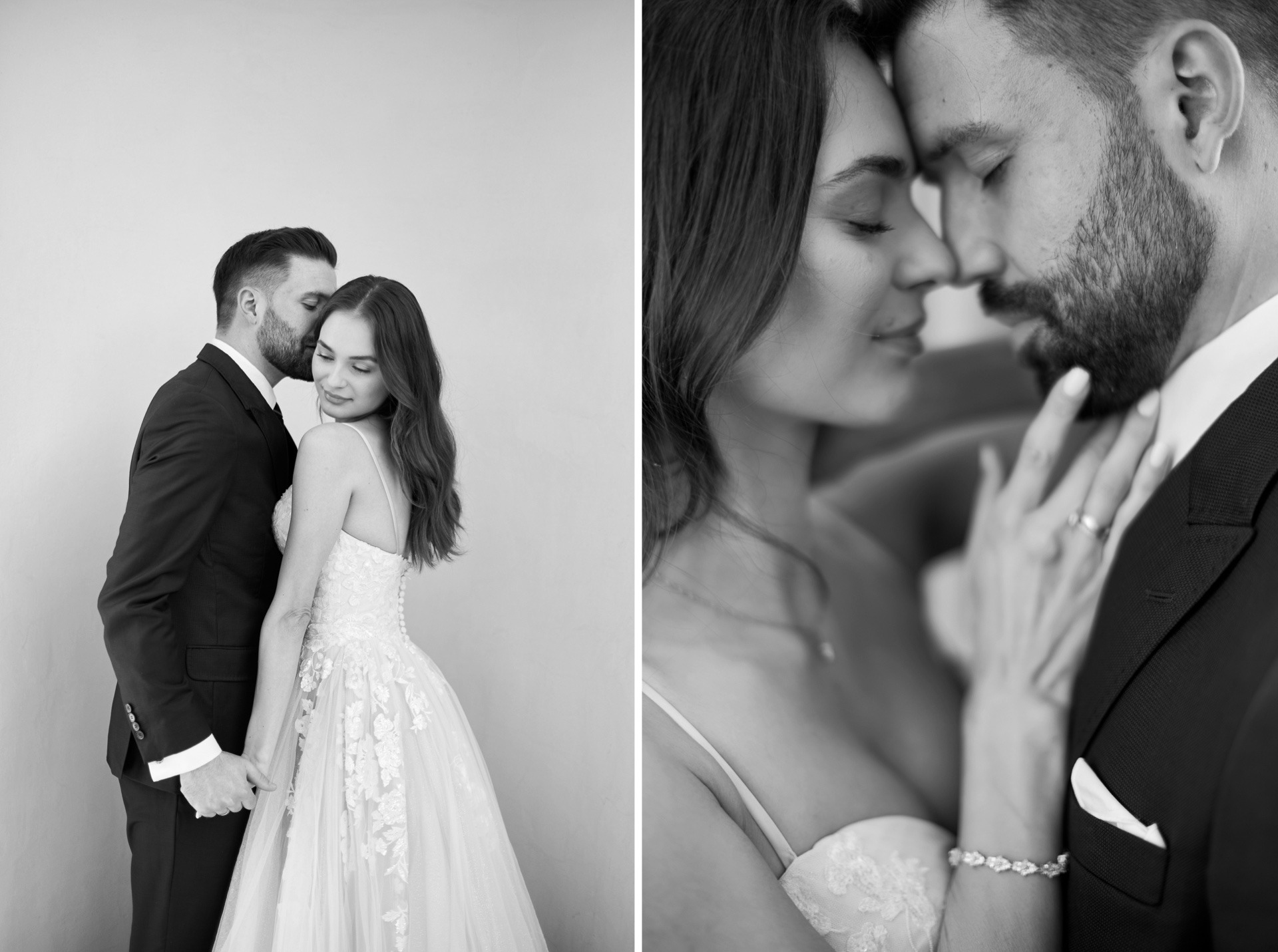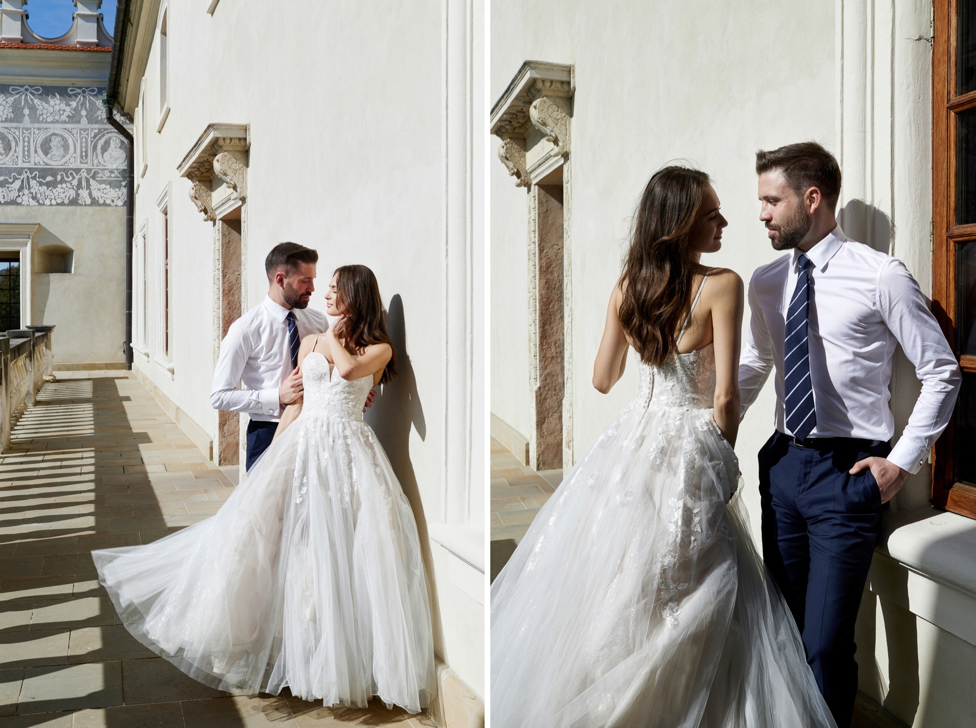 Pogoda była cudowna, słońce nam sprzyjało, dzięki czemu biel sukni ślubnej korespondował z pastelowymi barwami ścian i podłóg, a promienie słoneczne podkreślało sielankowy nastrój, jaki Młodych nie opuszczał tego dnia. Naturalne ujęcia, romantyczne gesty, trochę zadumy i dużo radości – plener ślubny na zamku w Krasiczynie zaliczamy do udanych!