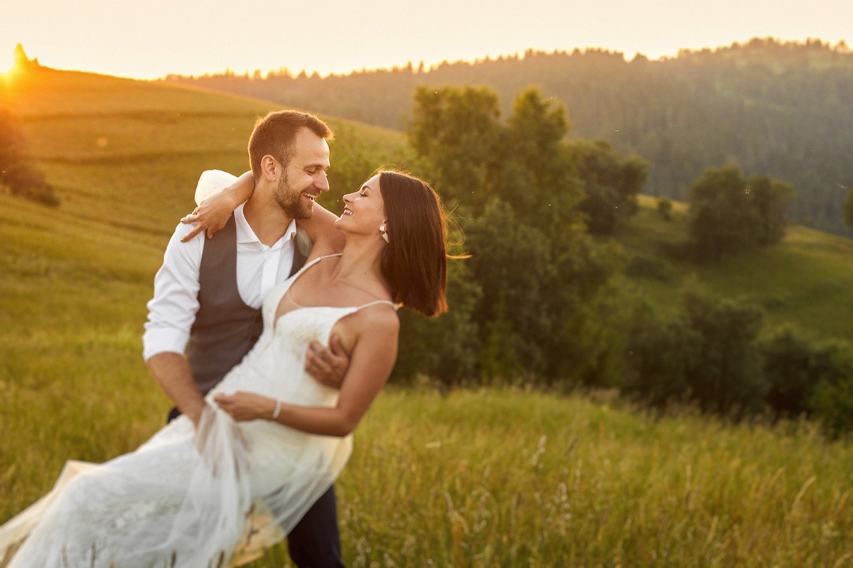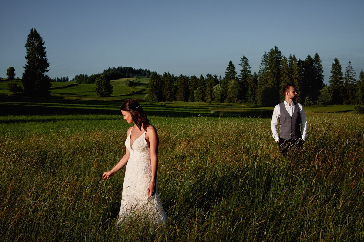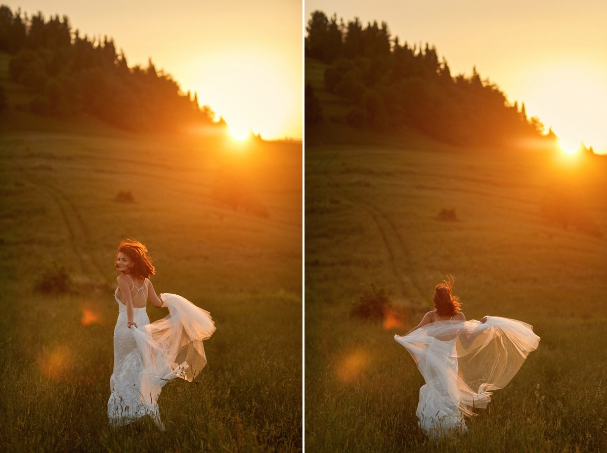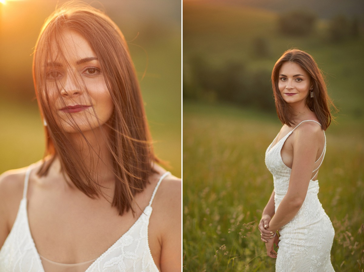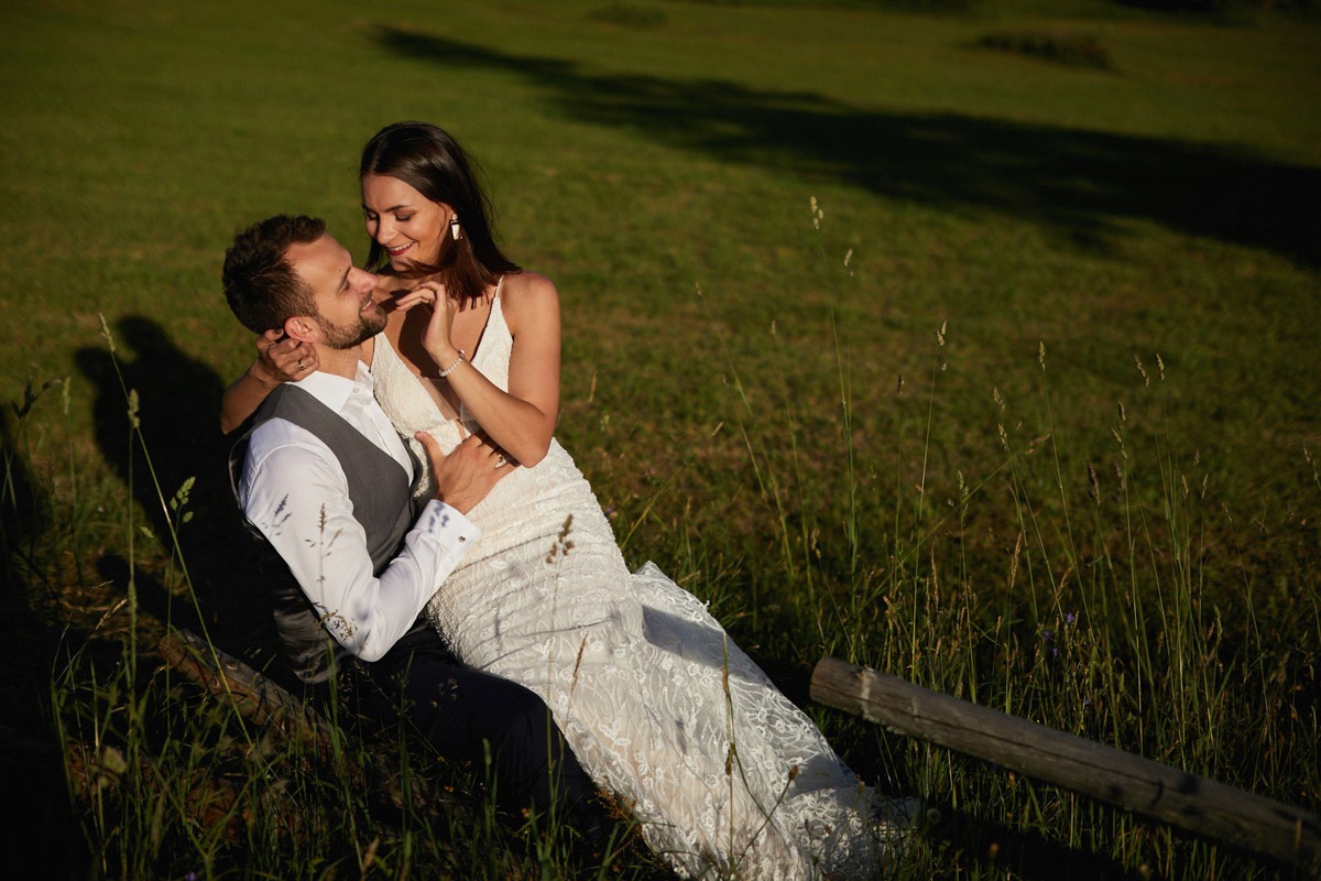 Ania i Andrzej to Para optymistów o pogodnym usposobieniu. Spacer po tatrzańskiej polanie był prawdziwą przyjemnością, a dla nich okazją do wypoczynku. Ja korzystałem z uroków najwyższych polskich gór, czerpiąc z nich możliwie najwięcej. Pogoda nam sprzyjała, błękit cudownie kontrastował z zielenią i złotem, które dominowały na polanie. Udało mi się także uchwycić zachód słońca w Tatrach, a odbijające się promienie słoneczne od zieleni budowały naprawdę niesamowity klimat. Ogromnym atutem tego miejsca było zróżnicowanie terenu oraz brak ludzi, co zagwarantowało swobodę podczas sesji ślubnej w Tatrach – najbardziej zatłoczonych górach w Polsce.
