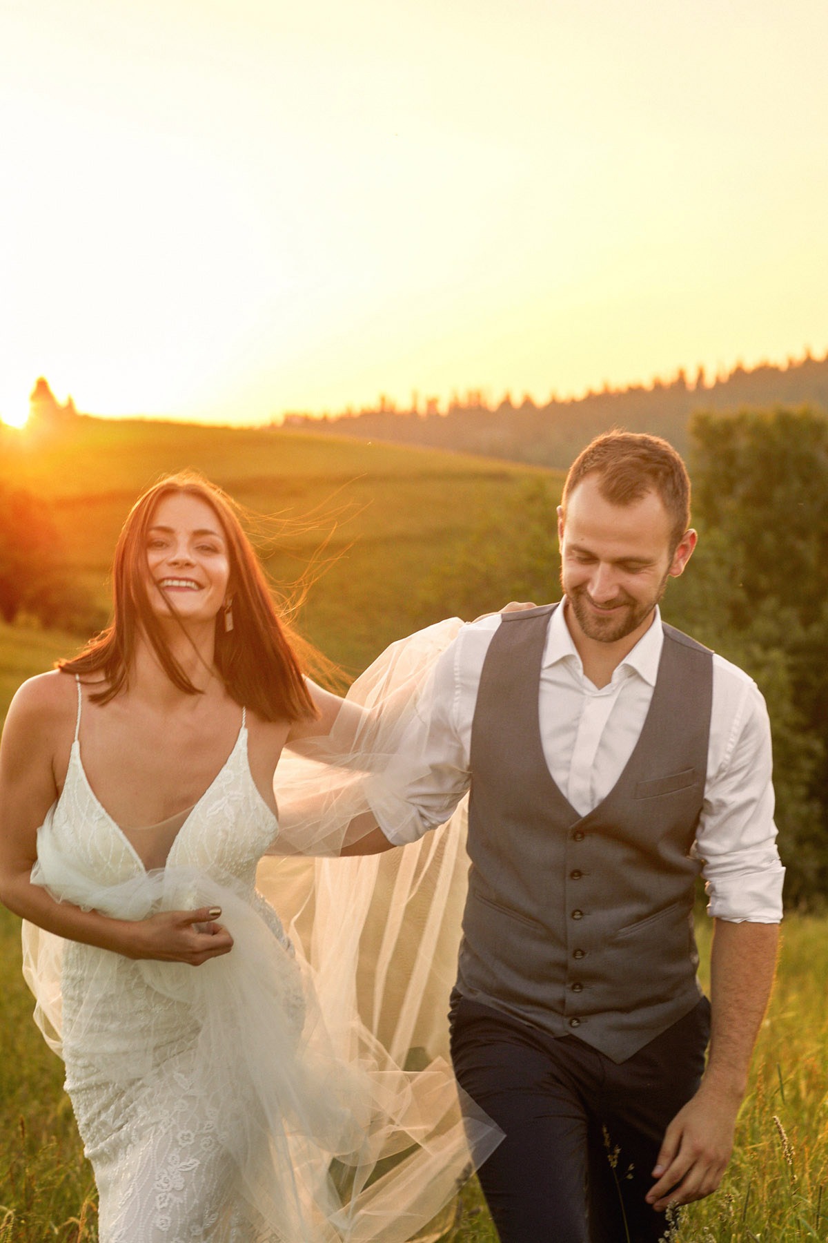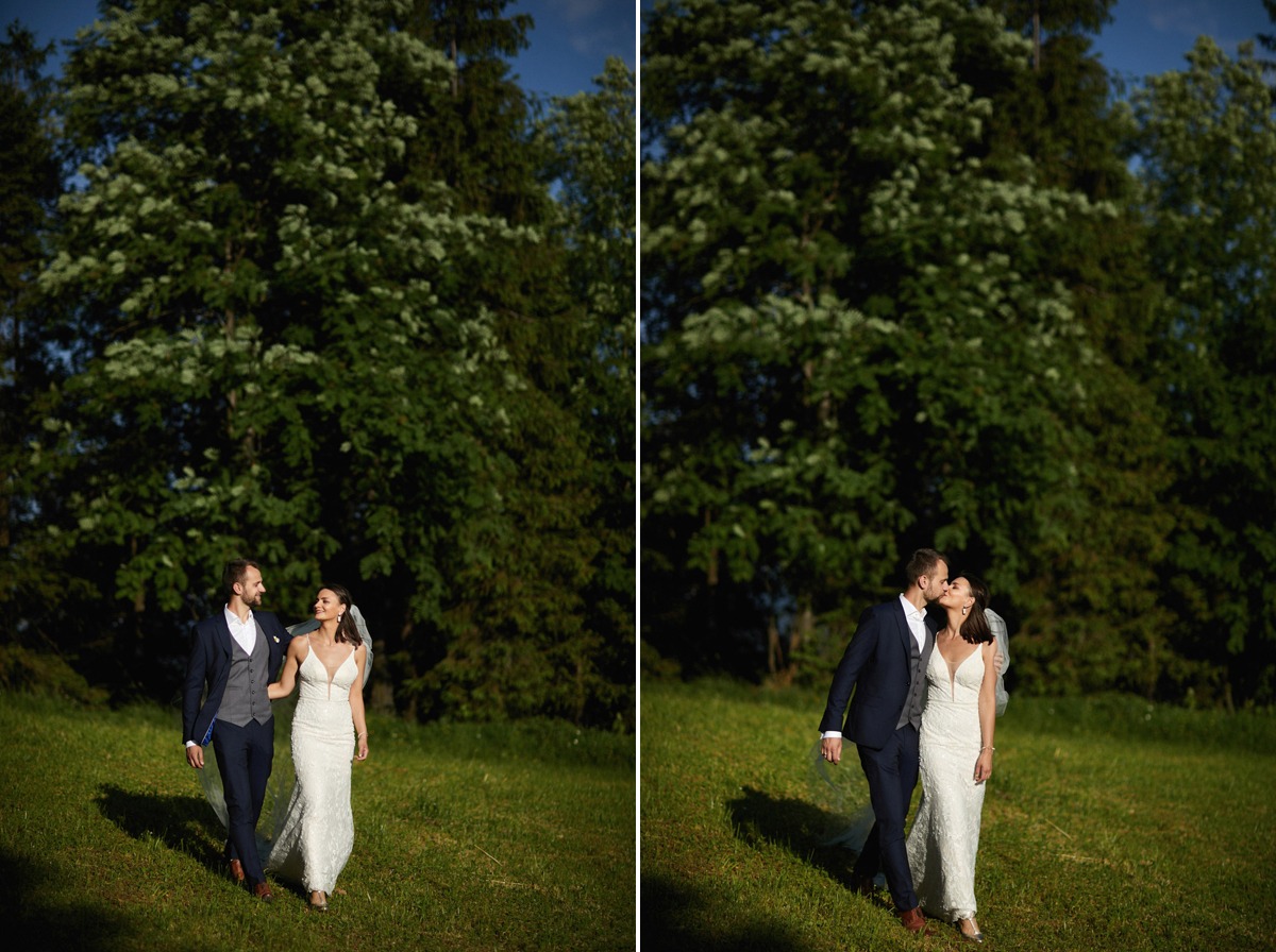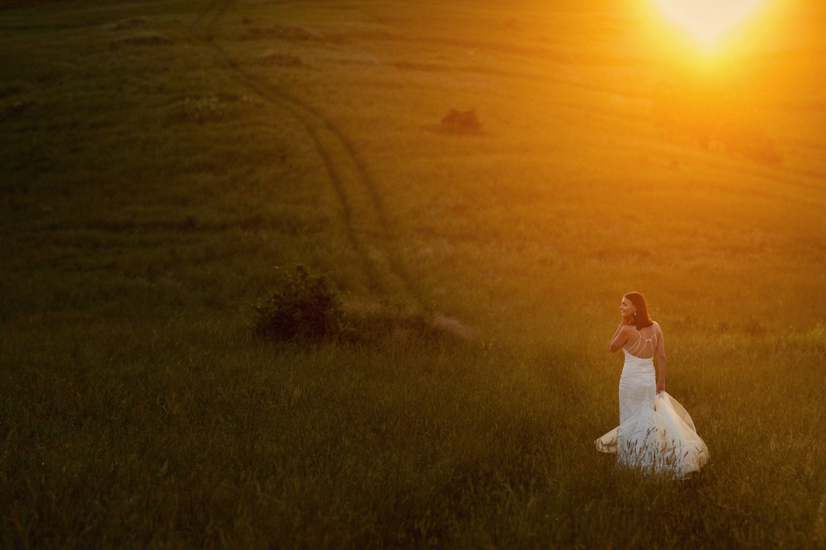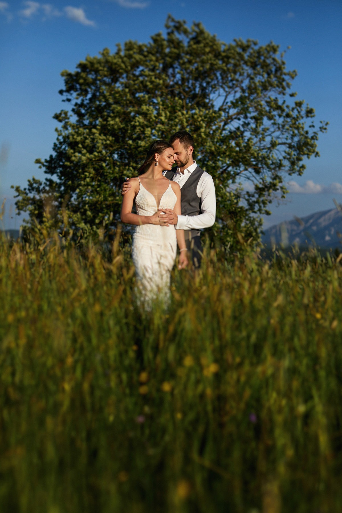 Ania i Andrzej to Para optymistów o pogodnym usposobieniu. Spacer po tatrzańskiej polanie był prawdziwą przyjemnością, a dla nich okazją do wypoczynku. Ja korzystałem z uroków najwyższych polskich gór, czerpiąc z nich możliwie najwięcej. Pogoda nam sprzyjała, błękit cudownie kontrastował z zielenią i złotem, które dominowały na polanie. Udało mi się także uchwycić zachód słońca w Tatrach, a odbijające się promienie słoneczne od zieleni budowały naprawdę niesamowity klimat. Ogromnym atutem tego miejsca było zróżnicowanie terenu oraz brak ludzi, co zagwarantowało swobodę podczas sesji ślubnej w Tatrach – najbardziej zatłoczonych górach w Polsce.