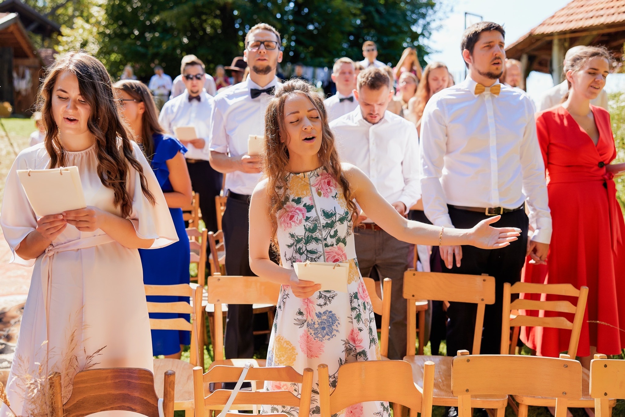 Ślub Oli i Bartka był prawdziwą ucztą dla zmysłów. Ceremonia odbyła się na łonie natury, gdzie zieleń drzew i śpiew ptaków stanowiły naturalne akompaniament dla tego wyjątkowego momentu. Dźwięki muzyki wypełniały przestrzeń, tworząc atmosferę pełną wzruszeń i radości. Kazanie głoszone na tle szumów lasu wniosło do tego sakralnego momentu dodatkową głębię.