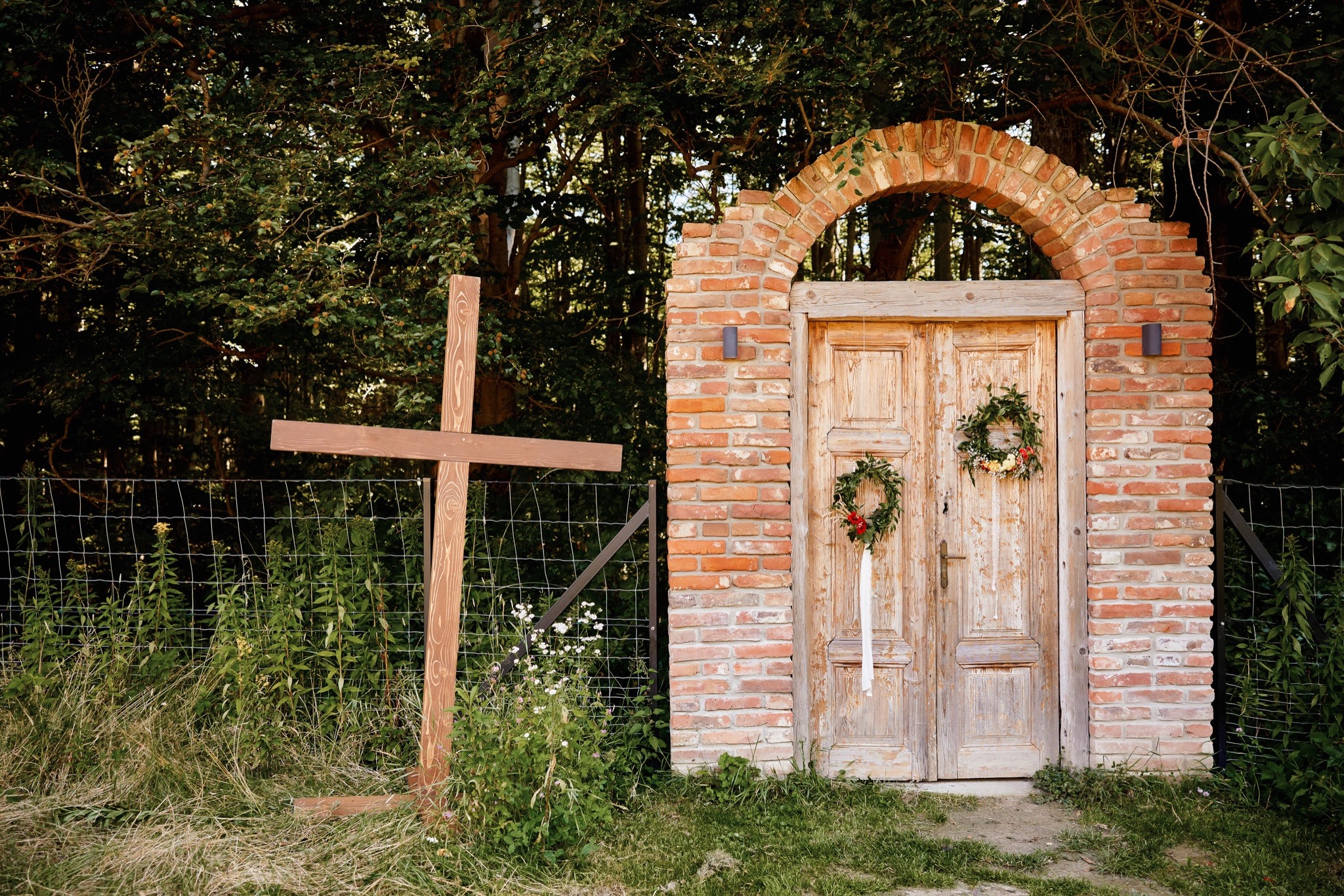 Stara Kuźnia nie wymagała wielu ozdób. Dekoracje były subtelne, nawiązując do prostoty natury i jednocześnie podkreślając urok tego miejsca. Rustykalne elementy, delikatne kwiaty i świeże zielone liście doskonale współgrały z atmosferą lasu i kuźni.